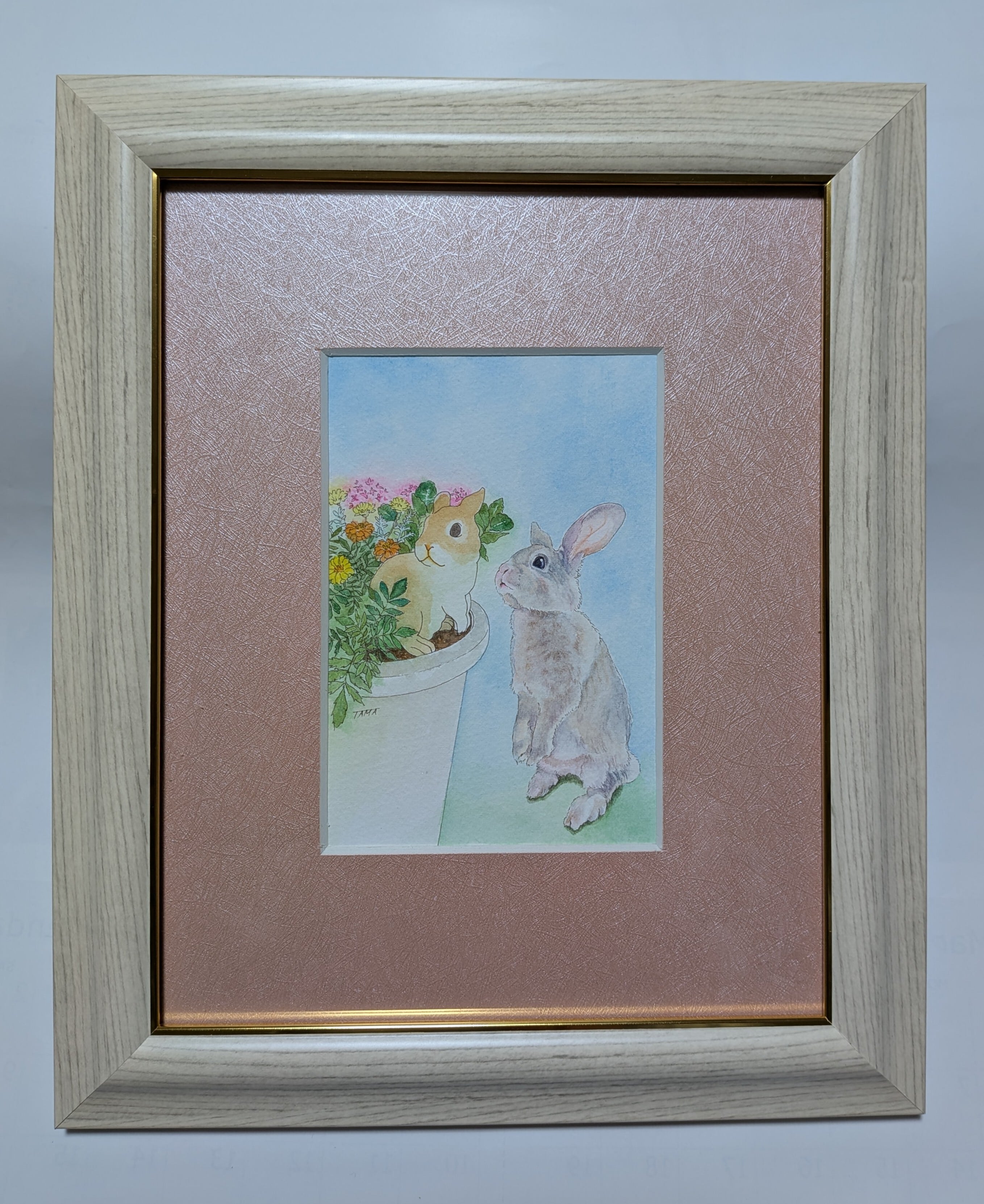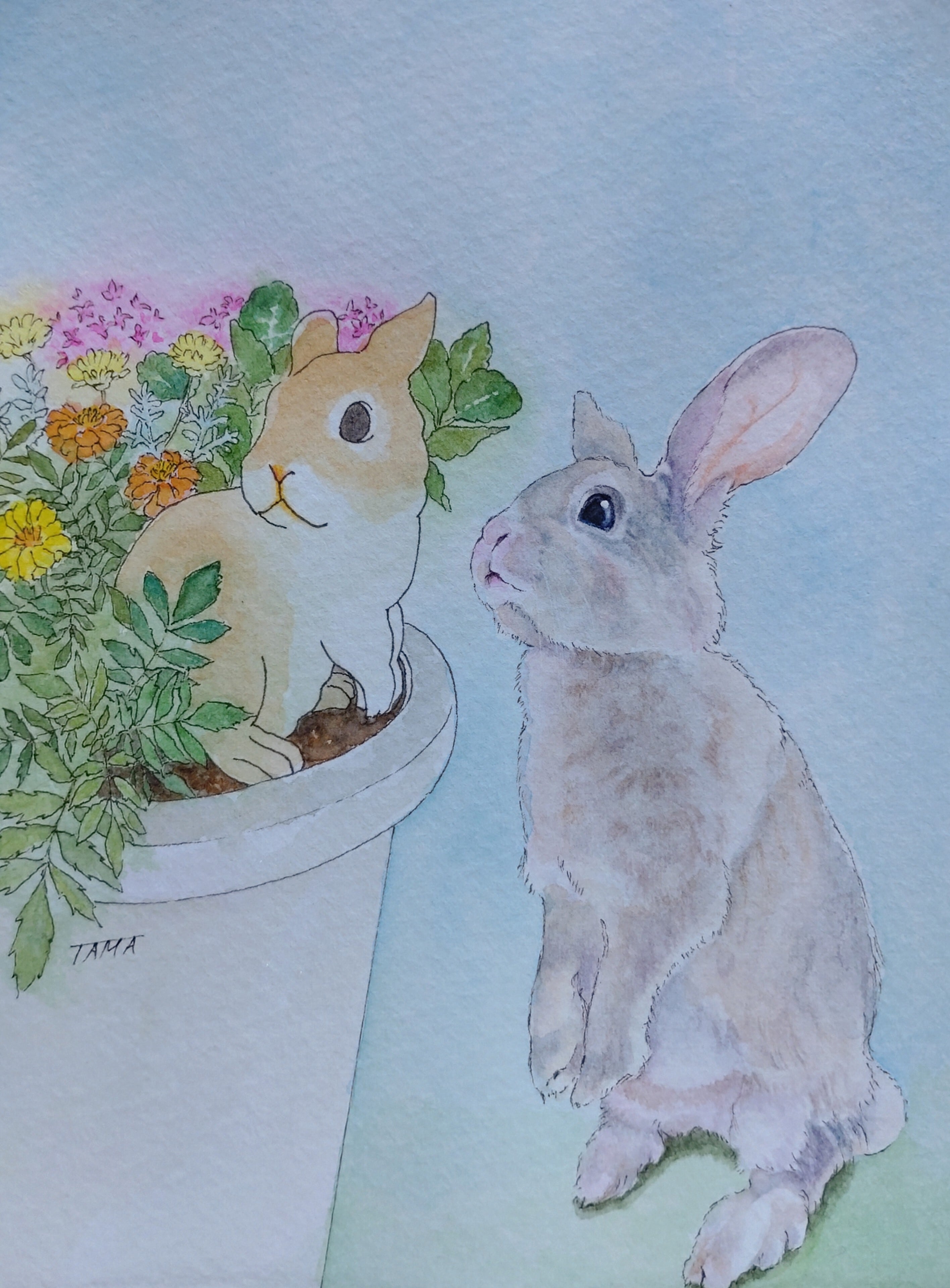 寄植えに飾られたうさぎの置物と友達になりたくって話しかけているうさぎさん。その可愛いらしい様子を描いています。