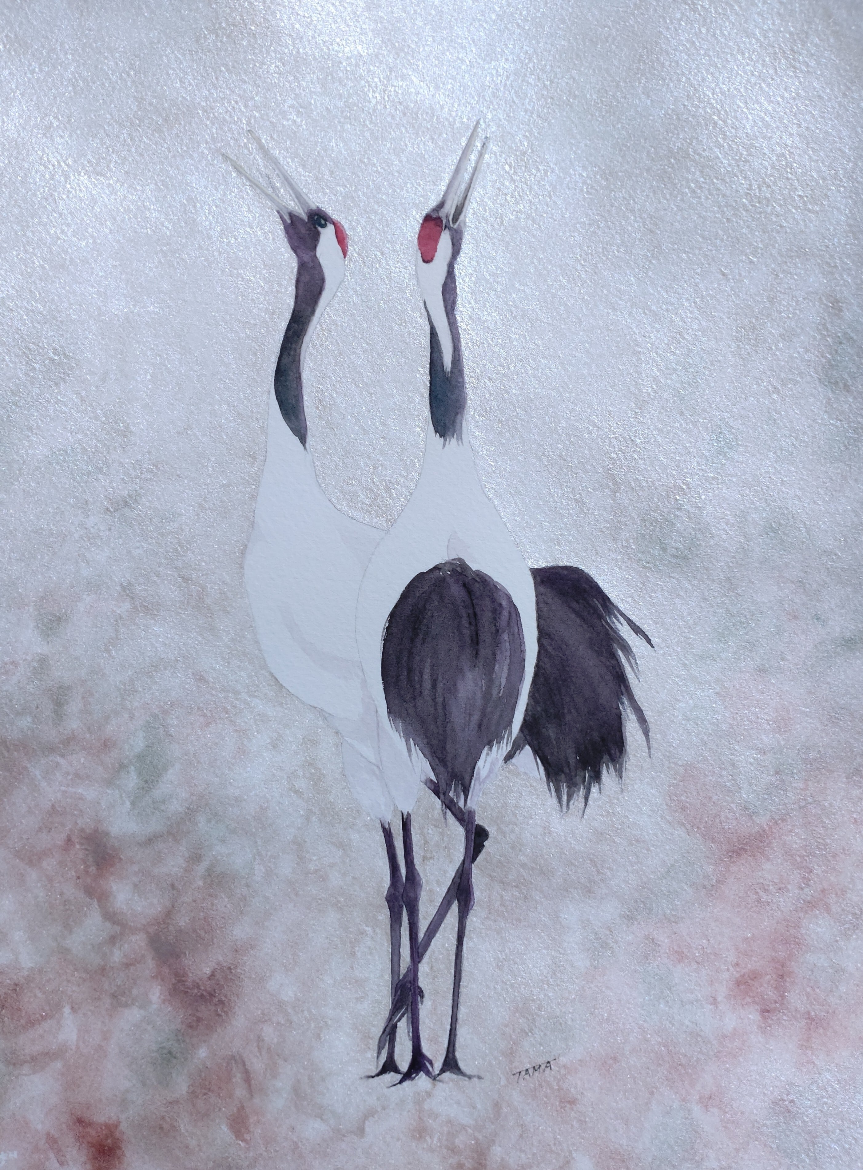 丹頂鶴の求愛シーンを描いています。