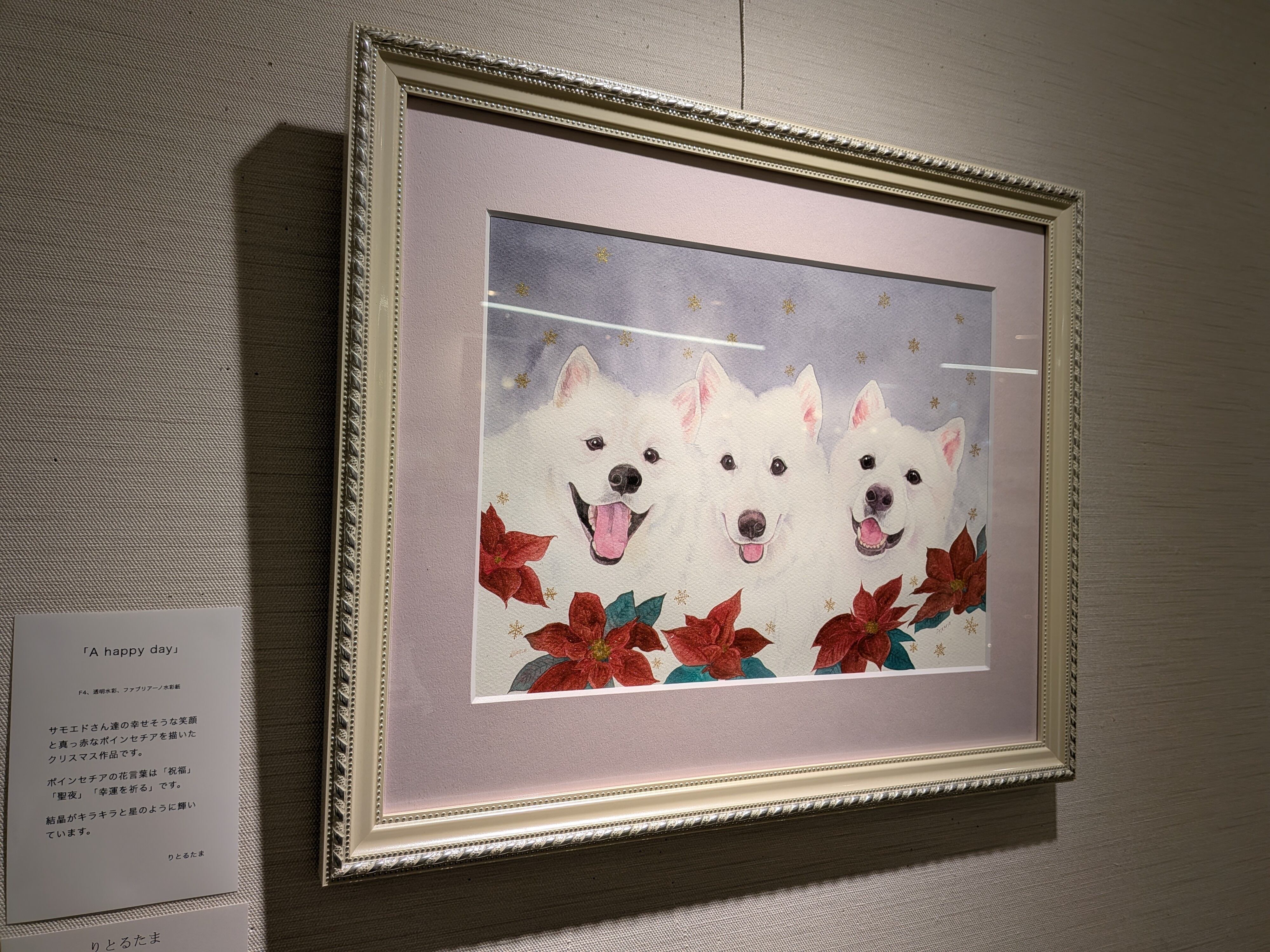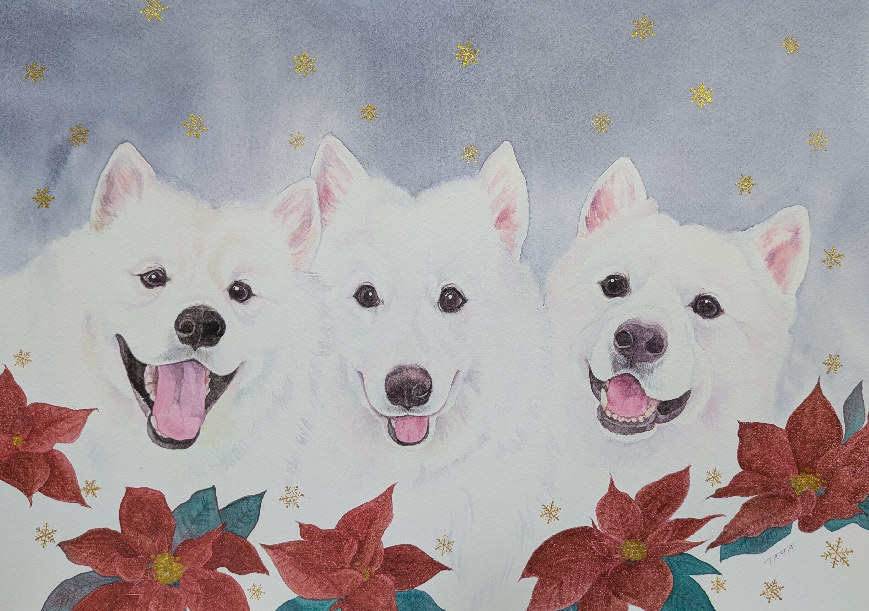 サモエドさんたちの明るい笑顔と真っ赤なポインセチアが幸せを運ぶクリスマス作品です。