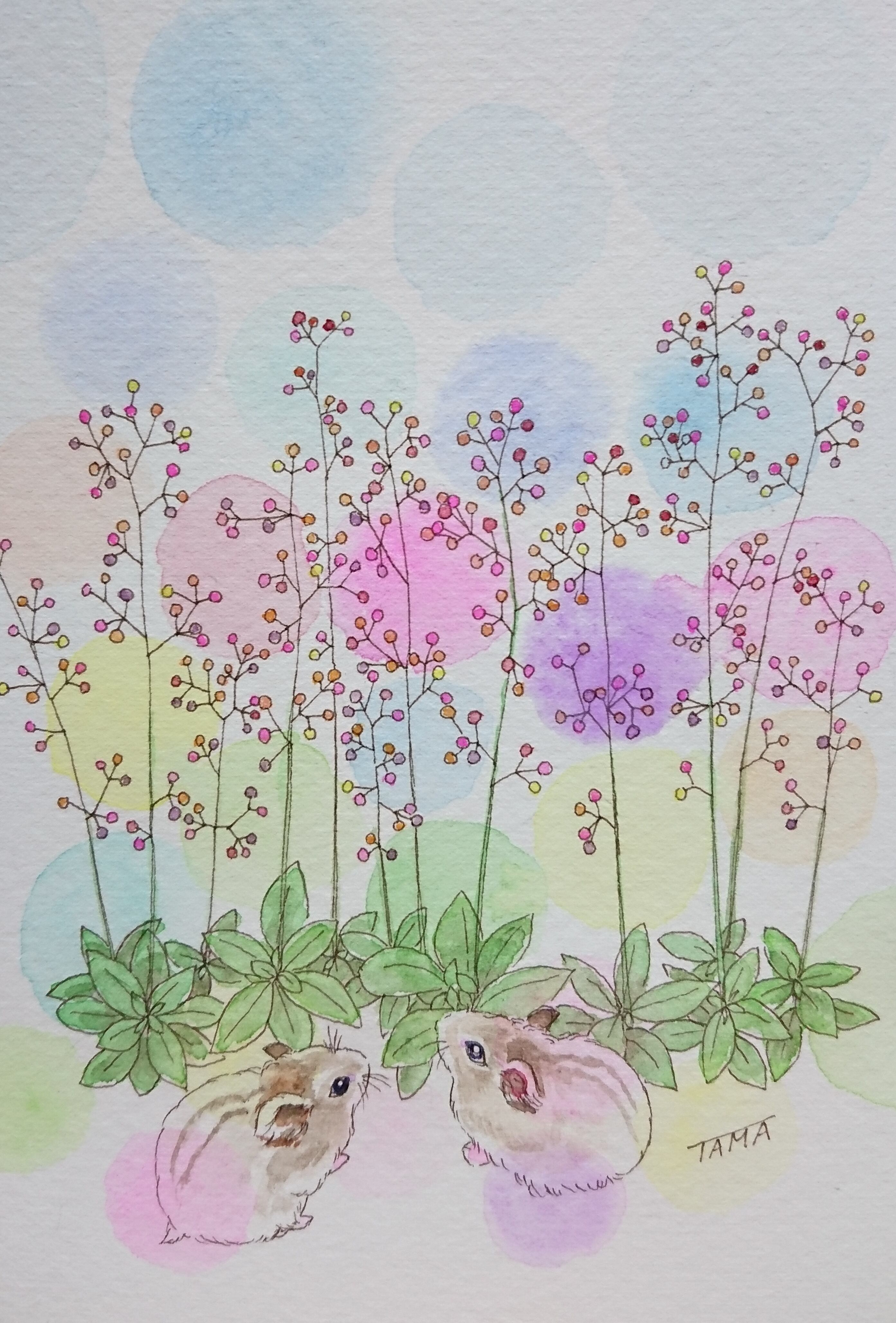 色とりどりのハゼランの下で2匹のジャンガリアンハムスターが仲良くハゼランを見上げています。かわいくポップな色使いの作品です。