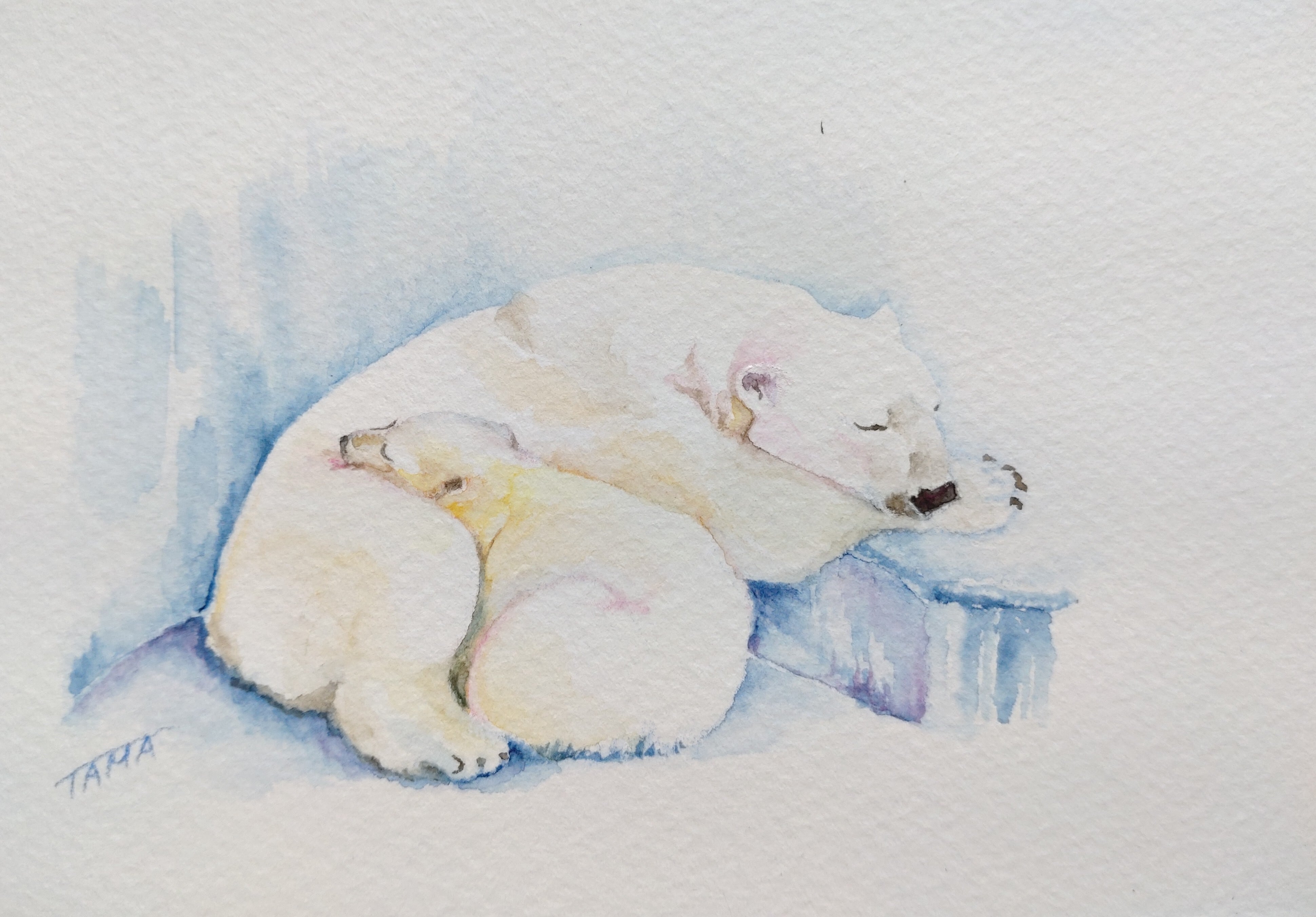 お母さんにくっついて安心した表情で白熊の赤ちゃんがお昼寝しています。透明水彩の柔らかなタッチで描いた優しい雰囲気の作品です。