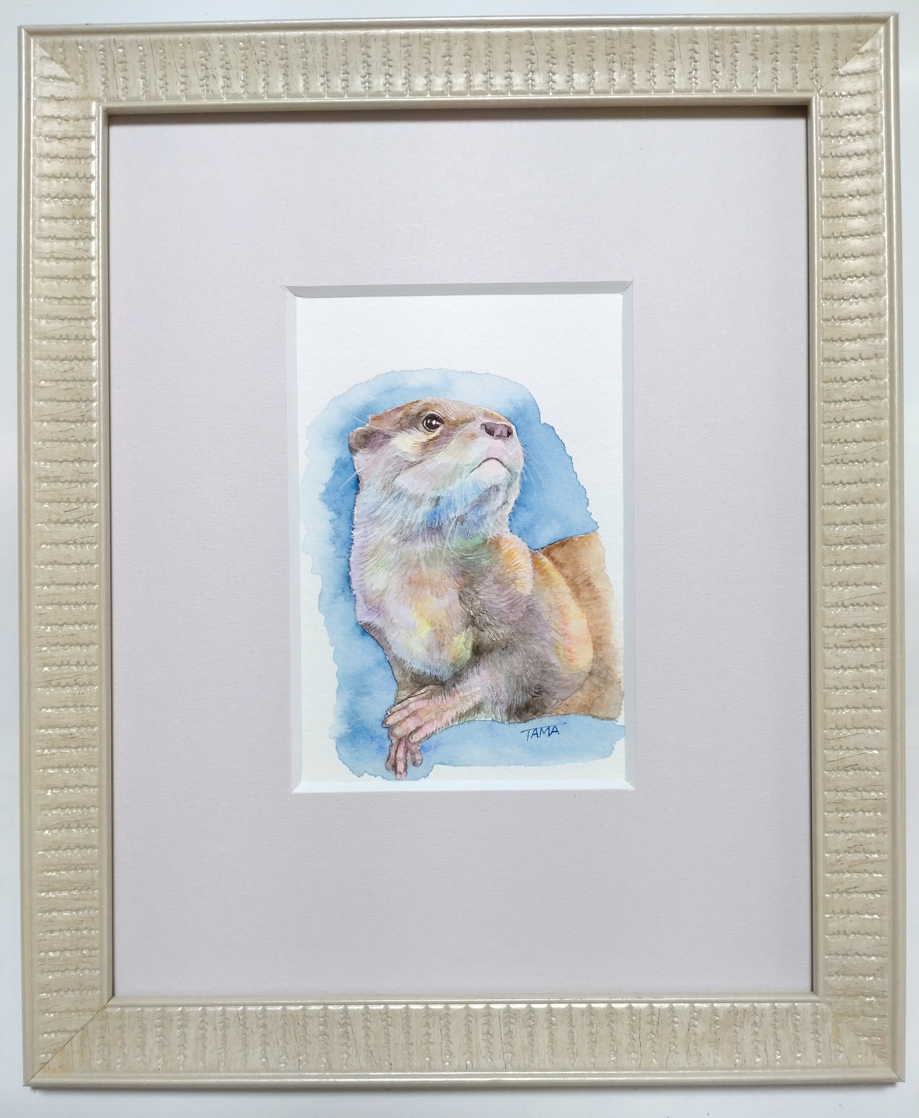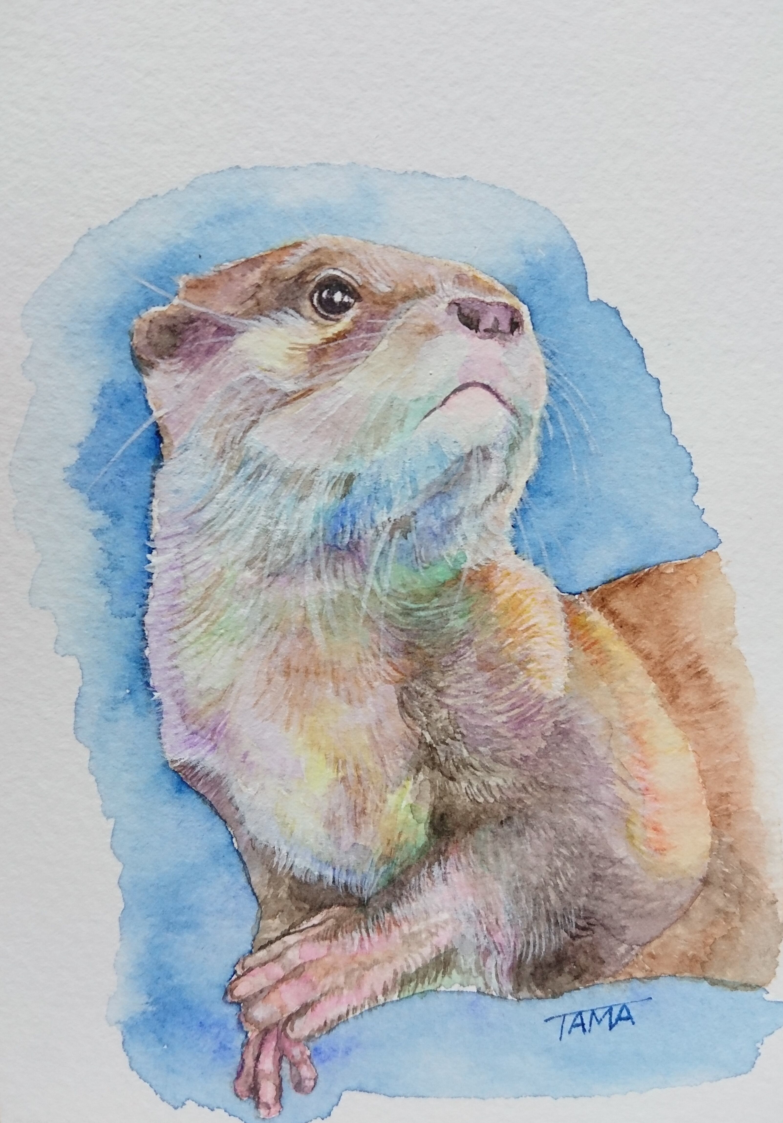 コツメカワウソの柔らかな表情を色彩豊かに描いた明るい作品です。