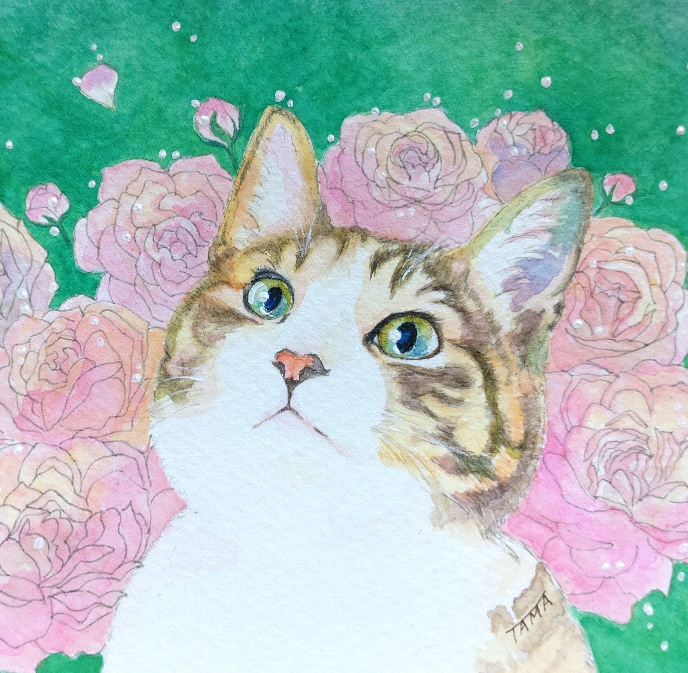 ラナンキュラスの花言葉は「とても魅力的」です。そのなかでもピンクのラナンキュラスは「飾らない美しさ」といわれています。猫ちゃんの表情が花言葉にぴったりな愛らしい作品です。