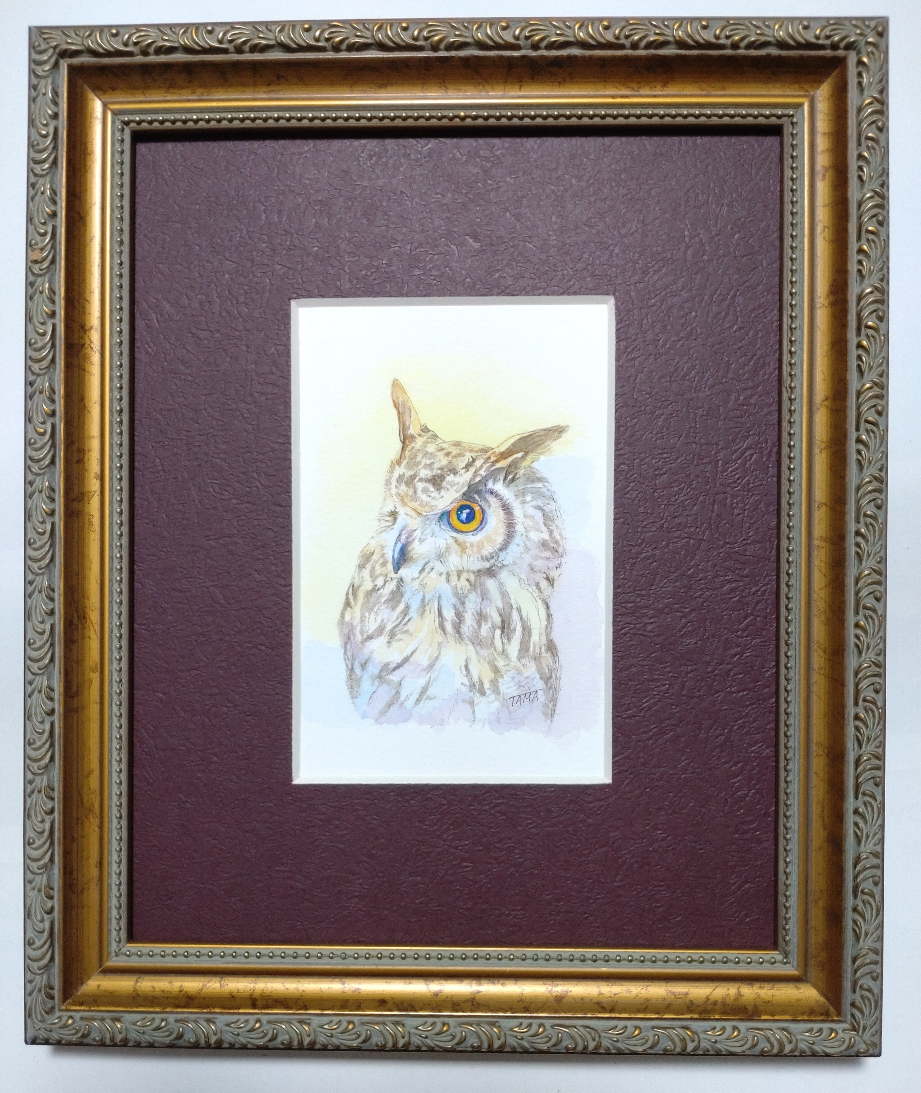 フクロウは森の物知り博士と呼ばれています。重厚な額装がフクロウの瞳の強さを引き立てています。