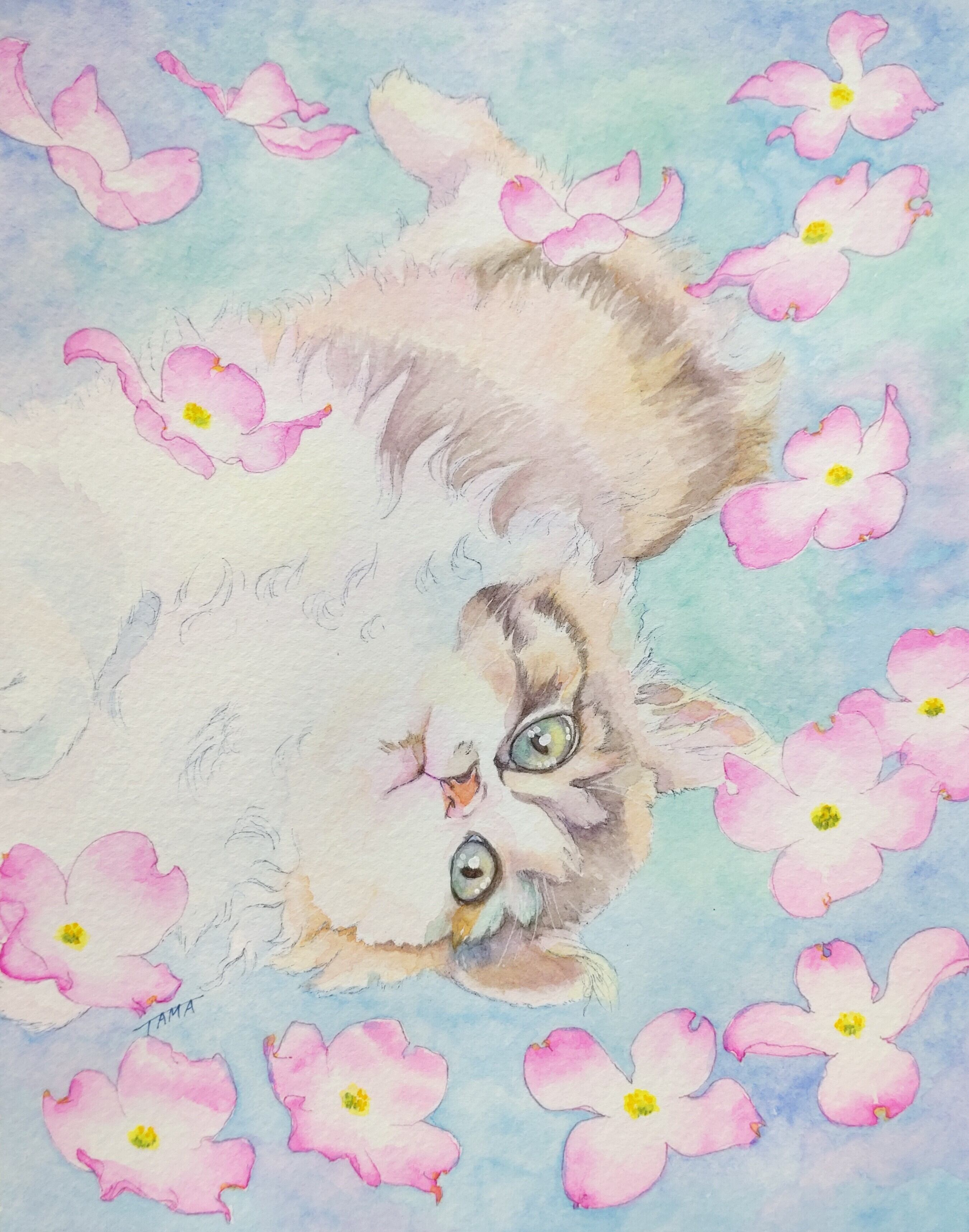 さわやかな青空の下で咲き誇る花水木の花を見上げている仔猫ちゃんを描きました。