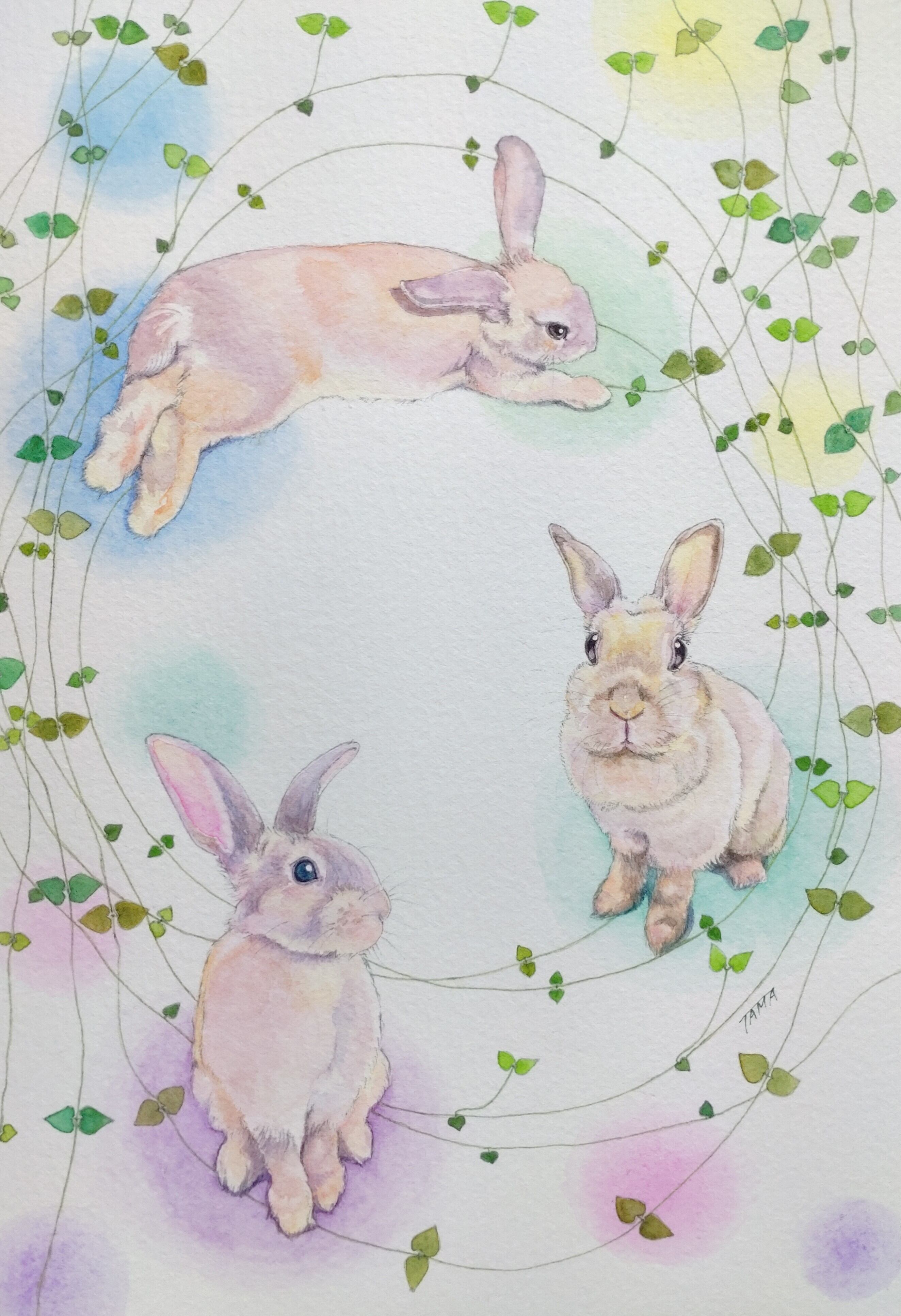 小さくて愛らしい存在を、円く描いた植物と一緒に柔らかく表現しました。透明水彩のやさしい色彩が、華やかなマット紙と額縁に引き立てられて、お部屋を明るく彩ります。