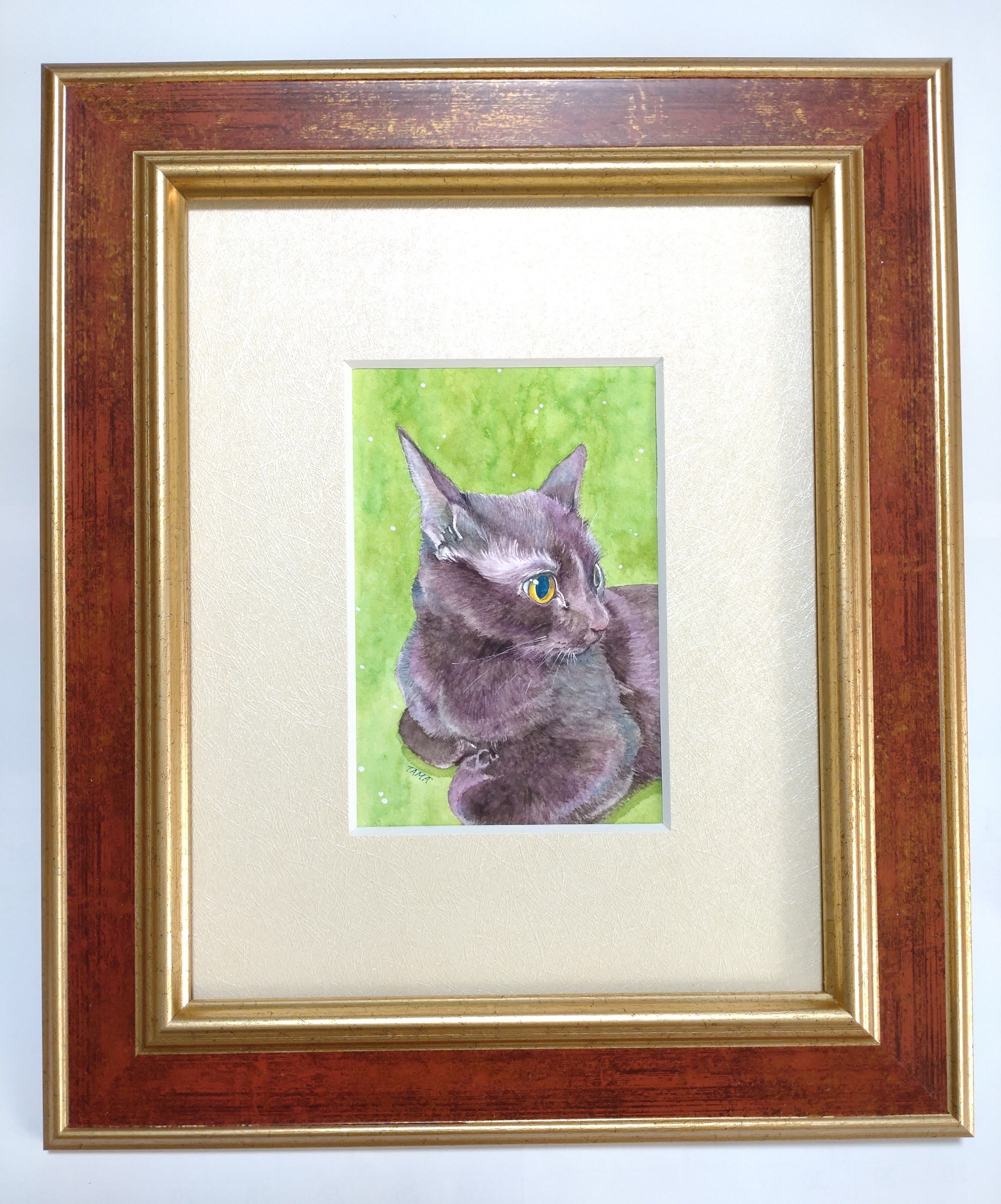 静かな眼差しの黒猫を、落ち着いたグリーンの背景に描きました。高級感のある額装が引き立てています。