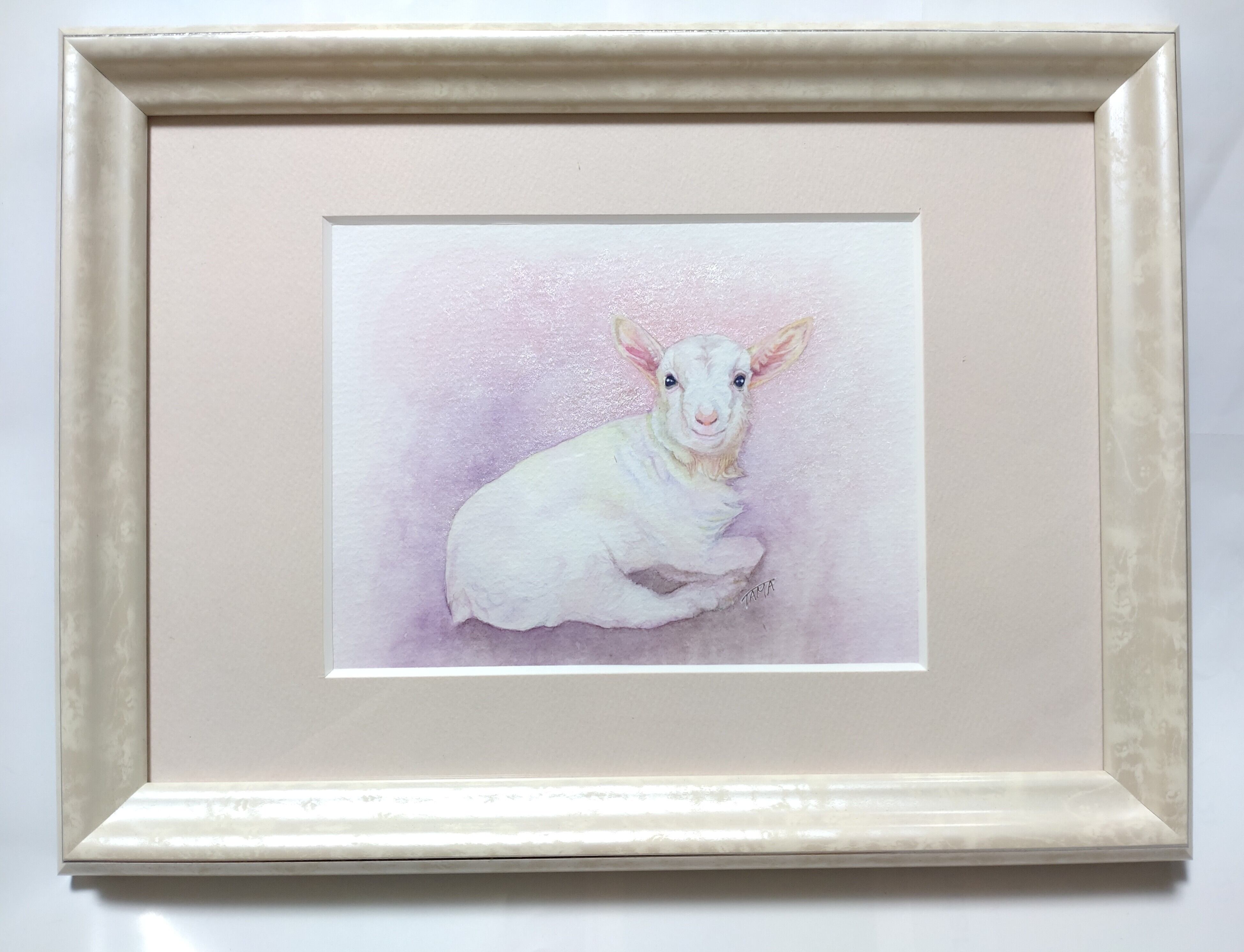 まっさらな表情でこちらを見つめています。天からの祝福を受けた赤ちゃんヤギを柔らかな光が包んでいる様子はパール絵具で表現しています。