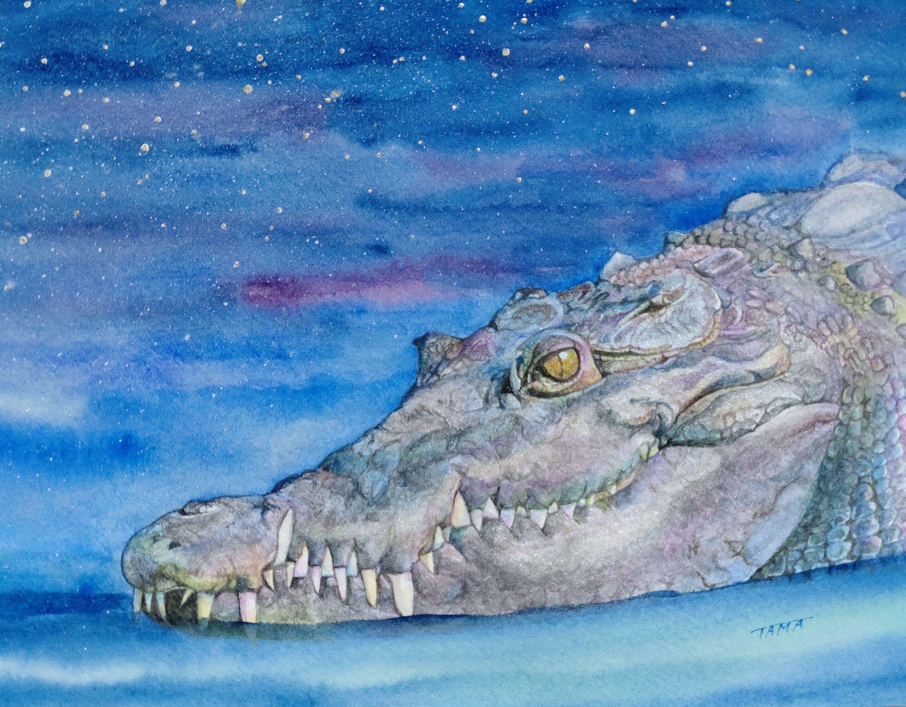 水面にゆれる星空のなかで、クロコダイルが一匹、自分だけの静かで豊かな時間を過ごしています。パール絵具がクロコダイルを美しく輝かせています。